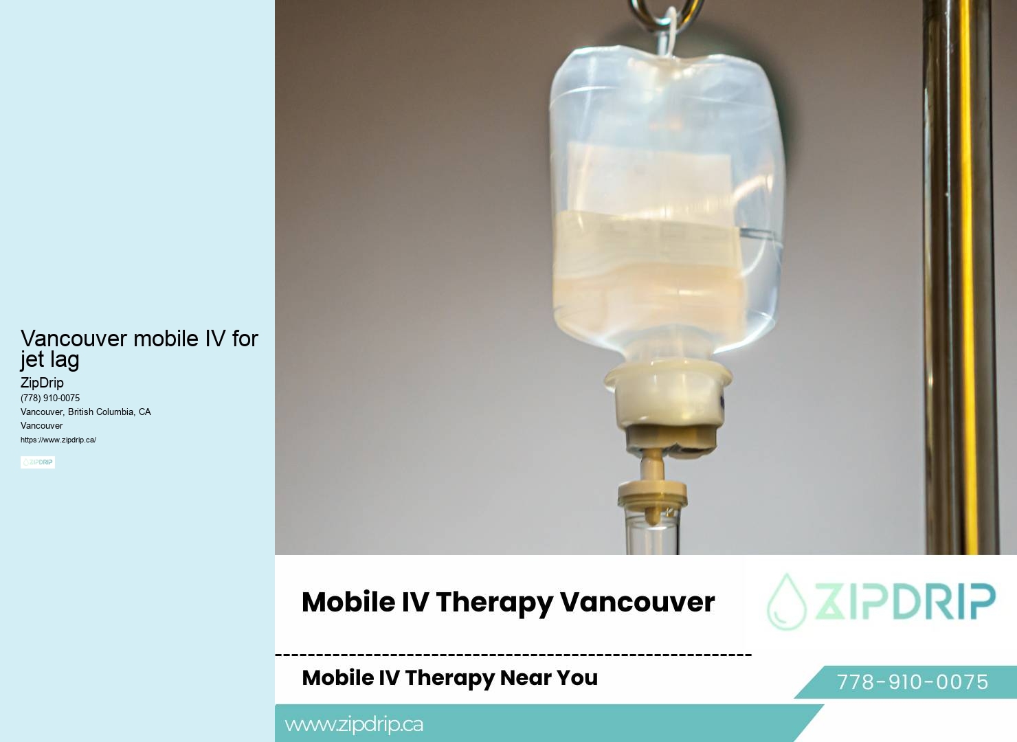 You can get your essential vitamins, hydration, and wellness treatments while you're at work, relaxing at home, or even during a social gathering. The equipment used is always sterile, and the substances administered are of the highest quality, sourced from reputable suppliers. In contrast, IV therapy delivers nutrients and hydration directly to your cells, providing an immediate health boost and faster recovery from a variety of conditions. You can set up your session at your home, office, or any location within Vancouver mobile IV for jet lag that suits you. IV therapy for flu symptoms ZipDrip prides itself on flexibility, so whether you're at home, in the office, or at a hotel, their professional team will come to you.