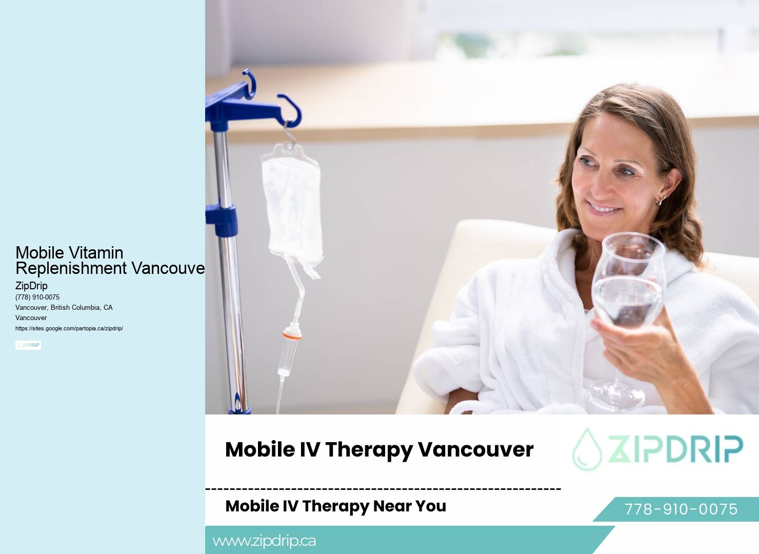 These IV drips are packed with vitamins, minerals, and antioxidants that your body needs to fight off infections and diseases. Minerals such as magnesium and calcium play their part too, helping in muscle recovery and nerve function. Vancouver, BC Imagine not having to leave your home or office to receive top-notch IV therapy. Learn more about Mobile IV Therapy Services Vancouver here. Learn more about Mobile Vitamin Replenishment Vancouver here You'll also find ZipDrip partnering with local gyms and wellness centers, providing tailored IV therapy packages to athletes and fitness enthusiasts.